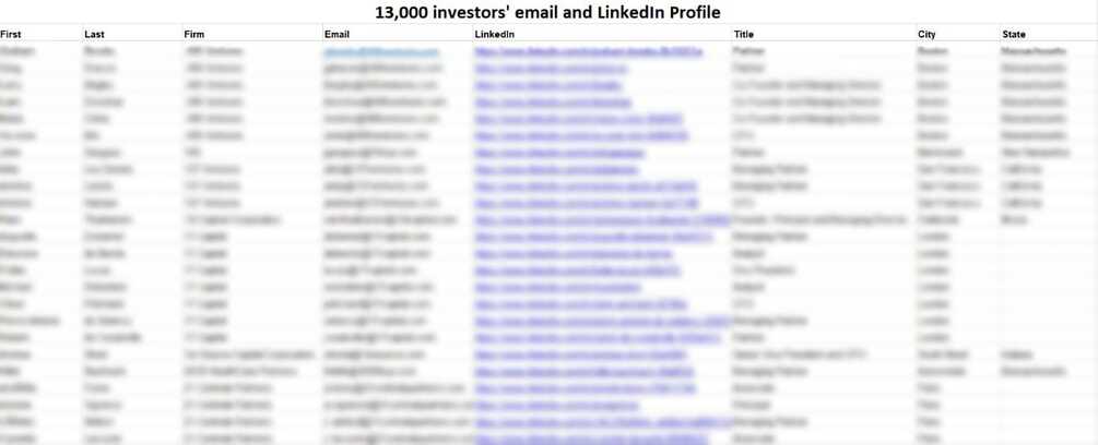 This package contains a database of more than 13,000 investors' email and LinkedIn Profile